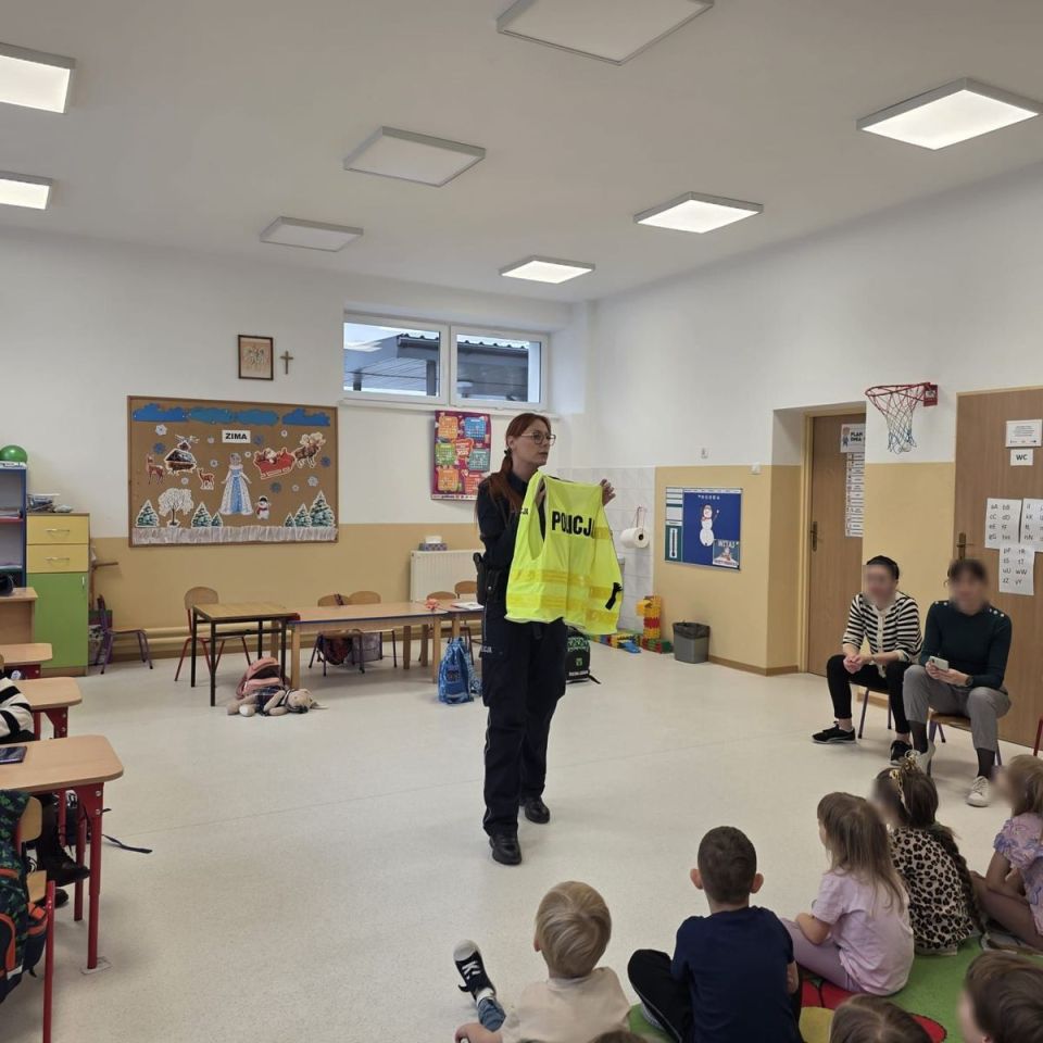 Funkcjonariuszka przypomniała dzieciom podstawowe zasady poruszania się po jezdni, bezpiecznego przechodzenia przez ulicę oraz zasady zabawy w domu i w przedszkolu. Wyjaśniła też, jakie zachowanie kierowcy ułatwia dostrzeżenie pieszego i dlaczego nawet niewielki odblask zwiększa szanse na uniknięcie niebezpiecznej sytuacji.